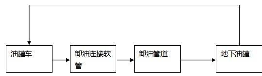 卸油工藝:油罐車行駛至加油站內(nèi)密封卸油口停車處,利用油罐車與地下儲油罐的高位差,采用密閉式卸油。采用油氣回收系統(tǒng),在油罐車卸油過程中,將原來儲油罐內(nèi)散溢的油氣,通過油氣回收地下工藝管線及卸車軟管重新收集至油罐車內(nèi),實(shí)現(xiàn)卸油與油氣等體積置換。其工藝流程如下圖:
