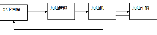 加油工藝:加油作業(yè)時,采用潛油泵提供的動力,油品通過加油管道至加油機(jī),進(jìn)入受油容器。同時,加汽油作業(yè)時,有油氣回收回收系統(tǒng),汽油蒸汽通過油氣回收管道回至汽油罐。具體流程見下圖: